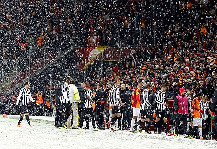 Всего 8 минут понадобилось жестокому стамбульскому снегопаду, чтобы превратить зеленый газон «Тюрк Телеком Арены» в белое полотно с толстым слоем снега.