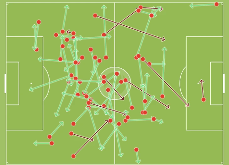 Каждую атаку «Локомотив» выжимал с серьезными трудностями, практически преодолевая себя. Кадровые проблемы снова оставили опорную зону без человека с классным пасом. Тигорев и Пейчинович предпочитали не рисковать и часто отыгрывали назад, что осложняло организацию наступления (схема передач – внизу).