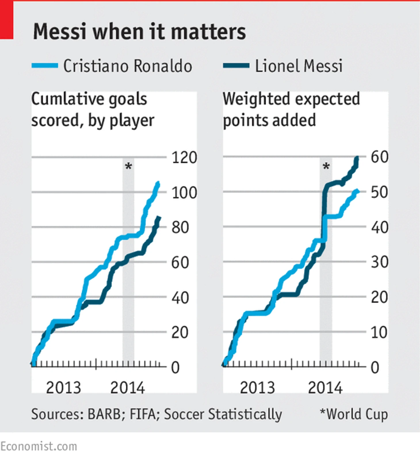 The Economist проанализировал по этой методике каждый гол Месси и Криштиану Роналду в 2013-2014 годах в чемпионате Испании, Лиге чемпионов и на чемпионате мира – и оказалось, что Месси забивает более важные мячи, чем Роналду.