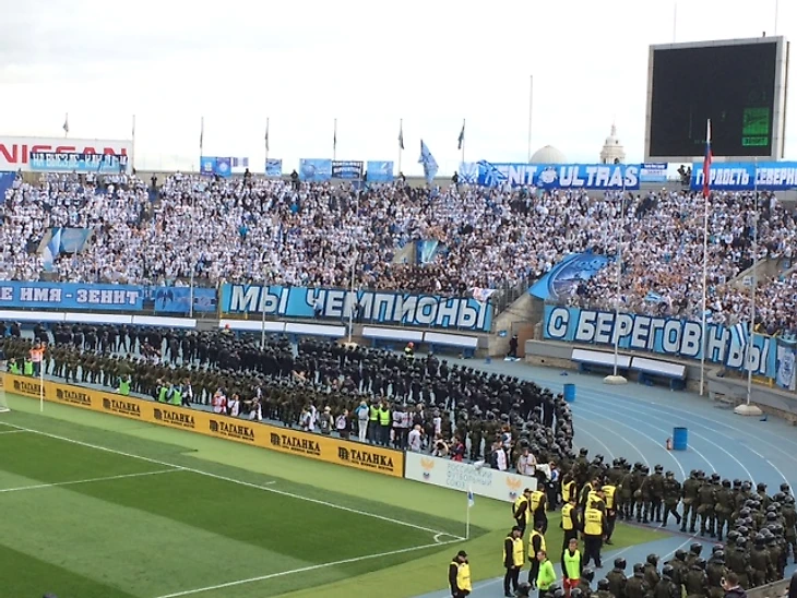 На «Петровском» вдруг раздался солдатский топот. Вдоль поля к фанатскому Виражу бежали внутренние войска – с начищенными до блеска черными дубинками и наколенниками. Такая картина устрашала и удивляла, ведь в пяти метрах от солдат спокойно, ничего не подозревая, бегали игроки «Уфы» и «Зенита», до свистка оставалось минут 10, а на трибунах не было и намека на какие-то беспорядки. Полиция просто сыграла на опережение – чтобы проблемные питерские болельщики не выбежали на поле и не спродюсировали новый скандал, им полностью перекрыли путь двумя шеренгами. В первой – грозный ОМОН и патрульно-постовая служба, во второй – молодые солдаты внутренних войск.