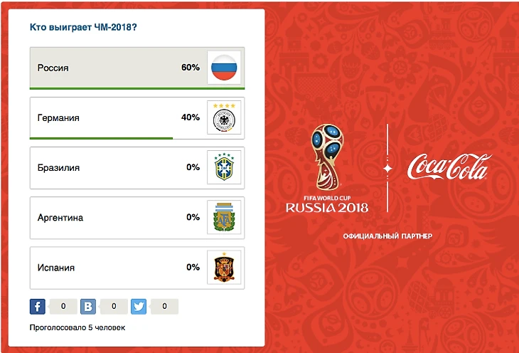 16:54 Пришло время пофантазировать – кто выиграет ЧМ-2018 в России? Отвечаем в самом низу страницы. Пока лидирует Россия – какие тут могут быть сомнения?