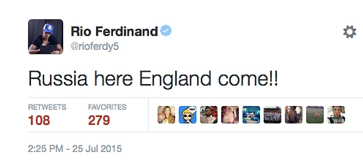 22:50 Рио Фердинанд очень обрадовался итогам жеребьевки (Словакия, Шотландия, Словения, Литва, Мальта) и написал в твиттере, что англичане уже едут в Россию.