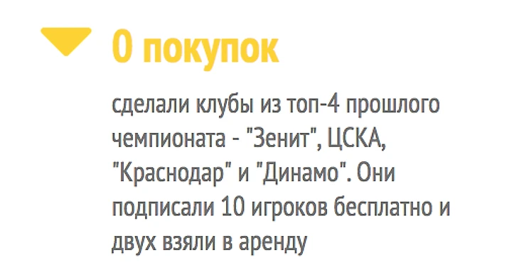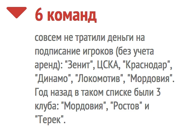 В итоге хотя бы за один трансфер в этом году заплатили 10 команд, а 6 обошлись только свободными агентами или арендами («Зенит», ЦСКА, «Краснодар», «Динамо», «Локомотив», «Мордовия»). В прошлом году молчаливых клубов было в два раза меньше, и они были поскромнее: «Мордовия», «Ростов», «Терек».