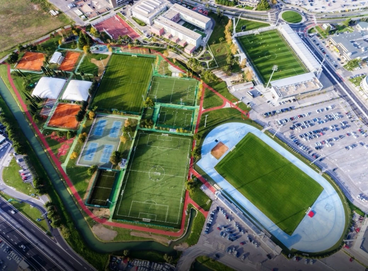На ближней части фото главное поле с натуральной травой и трибуной. Далее 2 полноценных натуральных поля. Плюс есть «коробка» и мини-футбольное поле (оба с искусственным покрытием) и еще небольшие дополнительные площадки по краям основных полей. Из нефутбольного есть хороший зал спортивной гимнастики, теннисные корты и площадка пляжного волейбола. При этом, футбол не является однозначно спортом номер один для словенцев. Гандбол, баскетбол, велогонки популярны не меньше футбола.