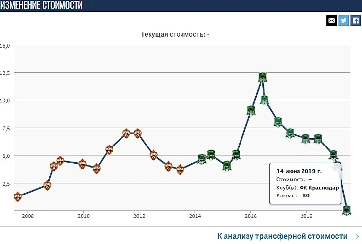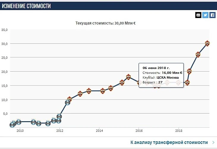 На второй строчке расположился уже ветеран московских армейцев – Алан Дзагоев (-5 млн. евро). Главным фактором снижения цены игрока является травматизм. Продолжительное нахождение в лазарете неминуемо влечёт за собой потерю спортивной формы, а, следовательно, и удешевление спортсмена. Первые полгода после травмы цена футболиста не меняется – ещё один принцип портала. Но если реабилитация затягивается, как у многострадального «армейца» Алана Дзагоева, кривая его стоимости, естественно, устремляется вниз.