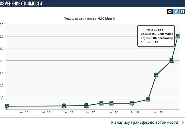 Седьмую строчку занимает Фёдор Смолов, который подешевел на 1,5 млн.евро. На это повлияло сразу несколько факторов: провальный для Фёдора чемпионат мира (у себя в голове он заранее (чисто на технике) положил хет-трик на ЧМ и поручил Герману Ткаченко разобраться с десятками предложений от грандов), игра за «Локомотив» не столь яркая, как была за «Краснодар», да и с годами Смолов не становится моложе – интерес зарубежных клубов пропадает.