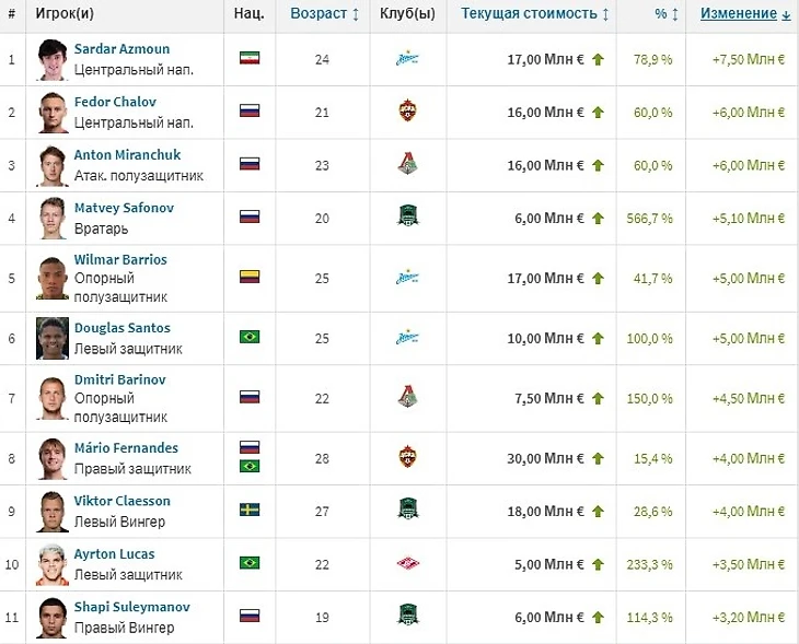 Лидерство Сердара Азмуна (+7,5 млн.евро за год), который перешел в прошлом сезоне из «Рубина» в «Зенит», не случайно. Иранец регулярно забивал за сине-бело-голубых и его голы во многом обеспечили чемпионство «Зениту». Игрок он достаточно молодой и стабильный, его результативная игра в совокупности с интересом со стороны европейских клубов, оказывает только положительную динамику на цену.