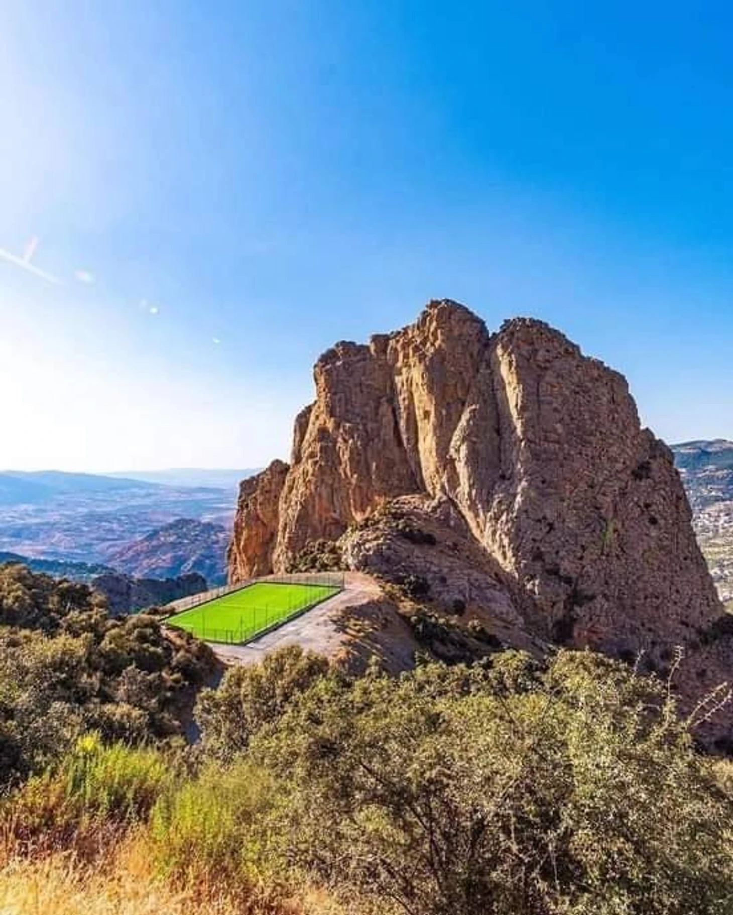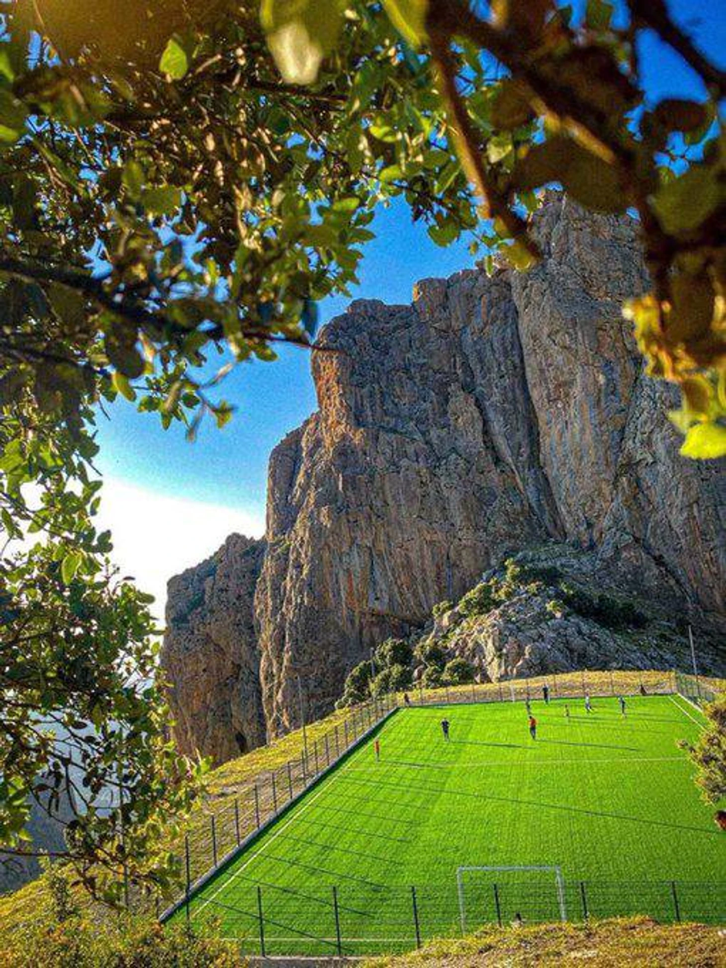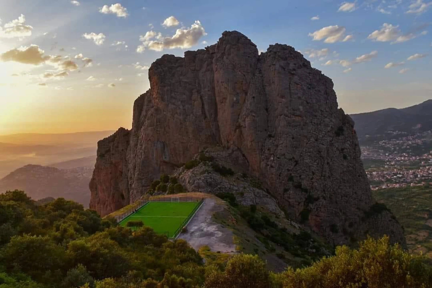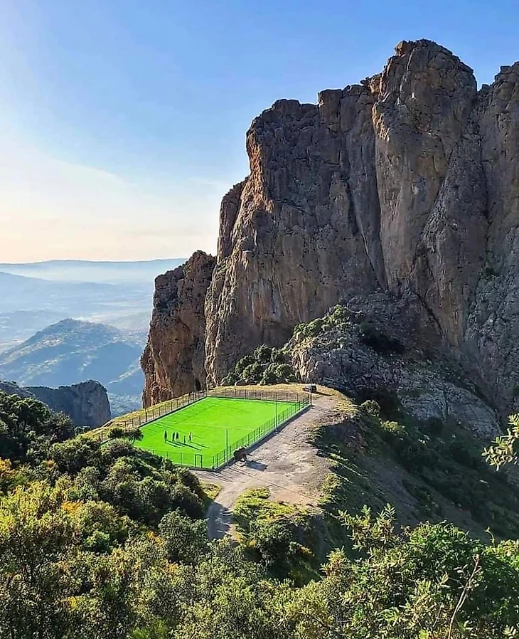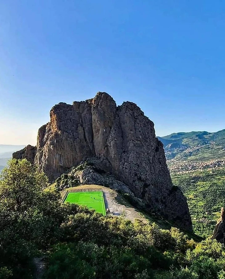 Футбольное поле расположено на высоте +1100 метров в горах Айт-Зики. На здешних холмах постоянно слышны звуки, с которыми футболисты борются за мяч.