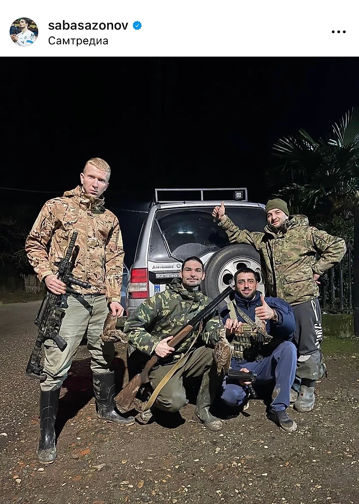 А вот его партнер по обороне Саба Сазонов поохотился в грузинском городе Самтредиа. Пару рябчиков Саба подстрелил.