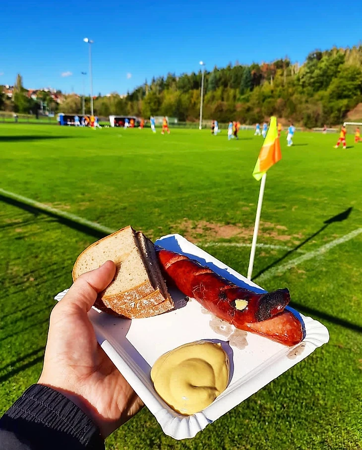 Болельщиков радуют традиционной жареной на гриле клобасой с плотной шкуркой; свинина внутри усеяна маленькими кусочками жира, делающими мясо более сочным и маслянистым. Кайф!