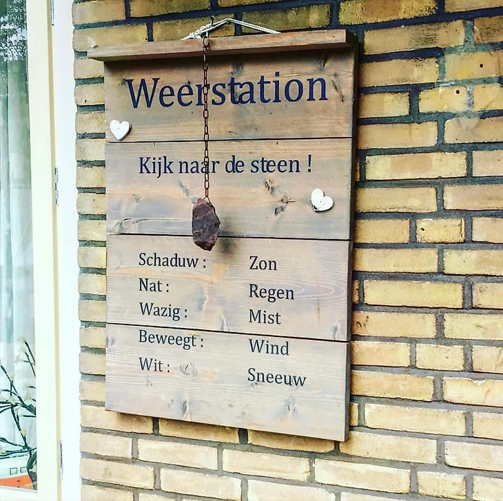 При входе вас встречает забавная метеостанция. Принцип действия следующий: камень мокрый — идет дождь; камень сухой — дождя нет; камень отбрасывает тень — ясно; камня не видно — туман; камень качается — ветрено; камень в белом — снег; камень ходит вверх-вниз — землетрясение; камня нет — обработка данных.