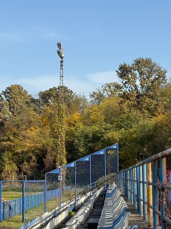 На противоположной стороне от электростанции расположена открытая трибуна с сектором, огороженным для болельщиков гостей.