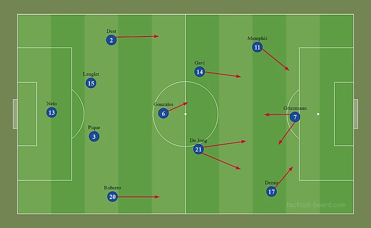 3. Необходимо похвалить молодёжь: Нико Гонсалес(19 лет) и Гави(16 лет) сыграли очень зрело для своего возраста, образовав в центре поля подвижный треугольник с Де Йонгом, а Демир(18 лет) был хорош в дриблинге и обострении, забил гол и в целом смотрелся убедительно.