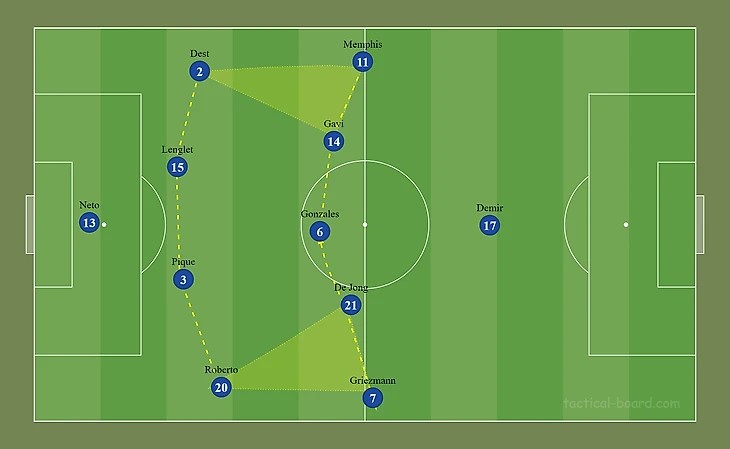 6. Без мяча команда активно шла в прессинг, а когда садилась ниже, то делала это в схеме 4-5-1, а не 4-4-2, как это часто было в последние сезоны. Данная расстановка помогает быстрее выходить в контратаки за счёт создания треугольников на флангах. Если проецировать данный способ игры в обороне на следующий сезон, то он выглядит реалистично(Мемфис и Гризманн опускаются по флангам, создавая пятёрку, а Месси остаётся выше).