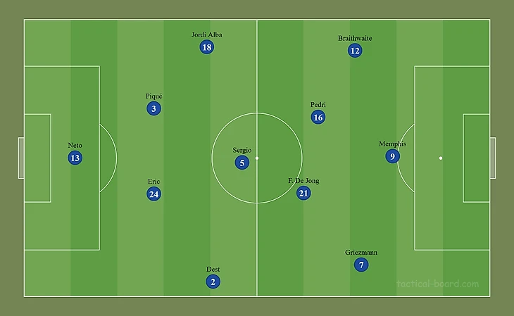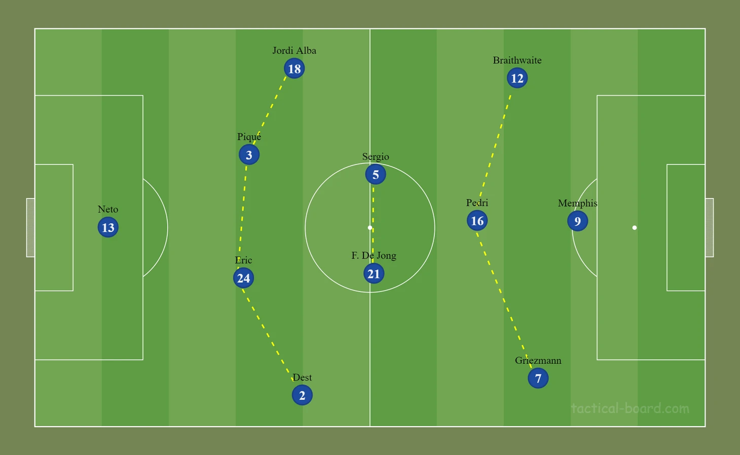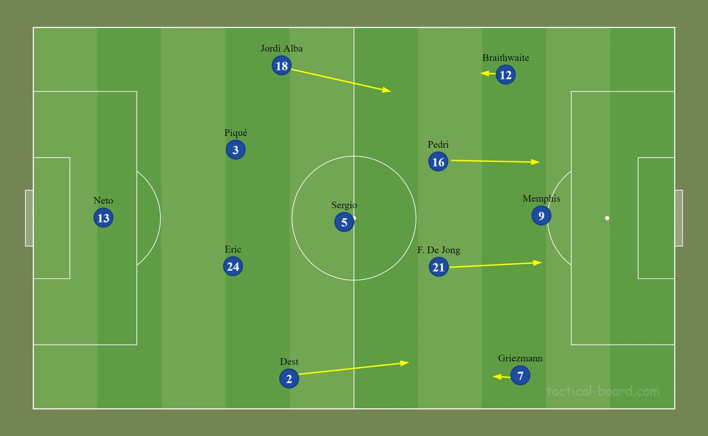 Брейтуэйт и Гризманн опускаются ниже, а Педри и Френки одновременно/попеременно начинают давление, помогая Депаю.