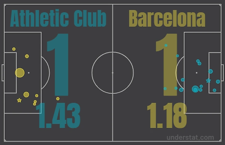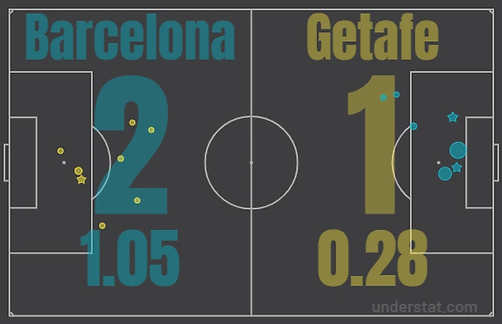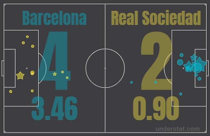 При начале атак команда разыгрывала коротко: первыми адресатами для передач чаще всего становились центральные защитники. Если соперник играл в двух нападающих, то Бускетс опускался, и, создавая тройку, мы выходили из-под первой линии прессинга. Дальше у игроков не было стабильных инструментов для игры в позиционном нападении: опускания Сержи к паре центральных защитников позволяло крайним защитникам находиться в более высоких позициях, но придумать что-то в атаке за счёт структурно выстроенной системы не удавалось: из 7 забитых мячей 1 - со стандарта и 4 - после вертикальных атак. По ожидаемым голам мы также не впечатлили: xG в матчах против Реал Сосьедада (3.46), Атлетика Бильбао (1.18), Хетафе (1.05) - Барса забила больше, чем создала, что говорит о высоком классе исполнителей, но не о структурном построении атак.