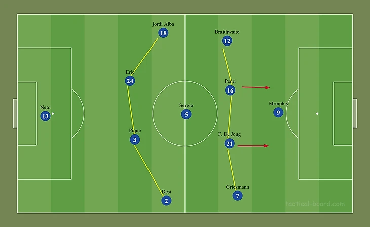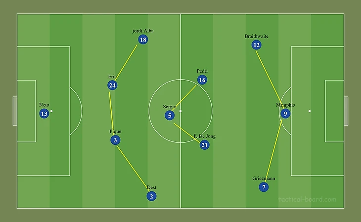 При прессинге инсайды Педри/Роберто и Де Йонг поднимались, помогая Депаю давить на линию обороны соперника, а вингеры Брейтуэйт и Гризманн ситуативно могли опускаться глубже.
