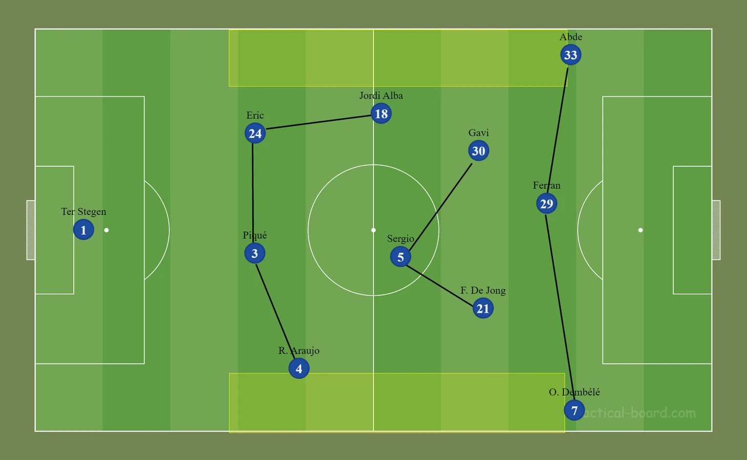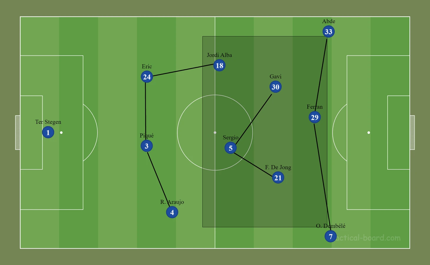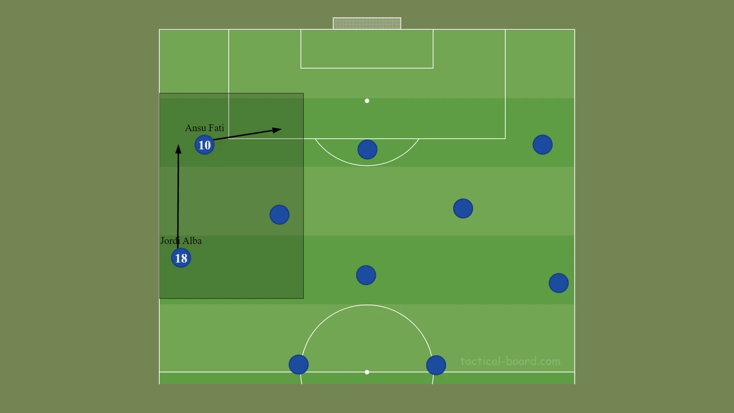 Отрицательной чертой данного расположения является оголение флангов: «Барса» наполняет середину большим количеством игроков, Абде и Дембеле создают ширину, но зона за их спинами остаётся пустой, что даёт сопернику возможность проведения потенциально опасной контратаки.
