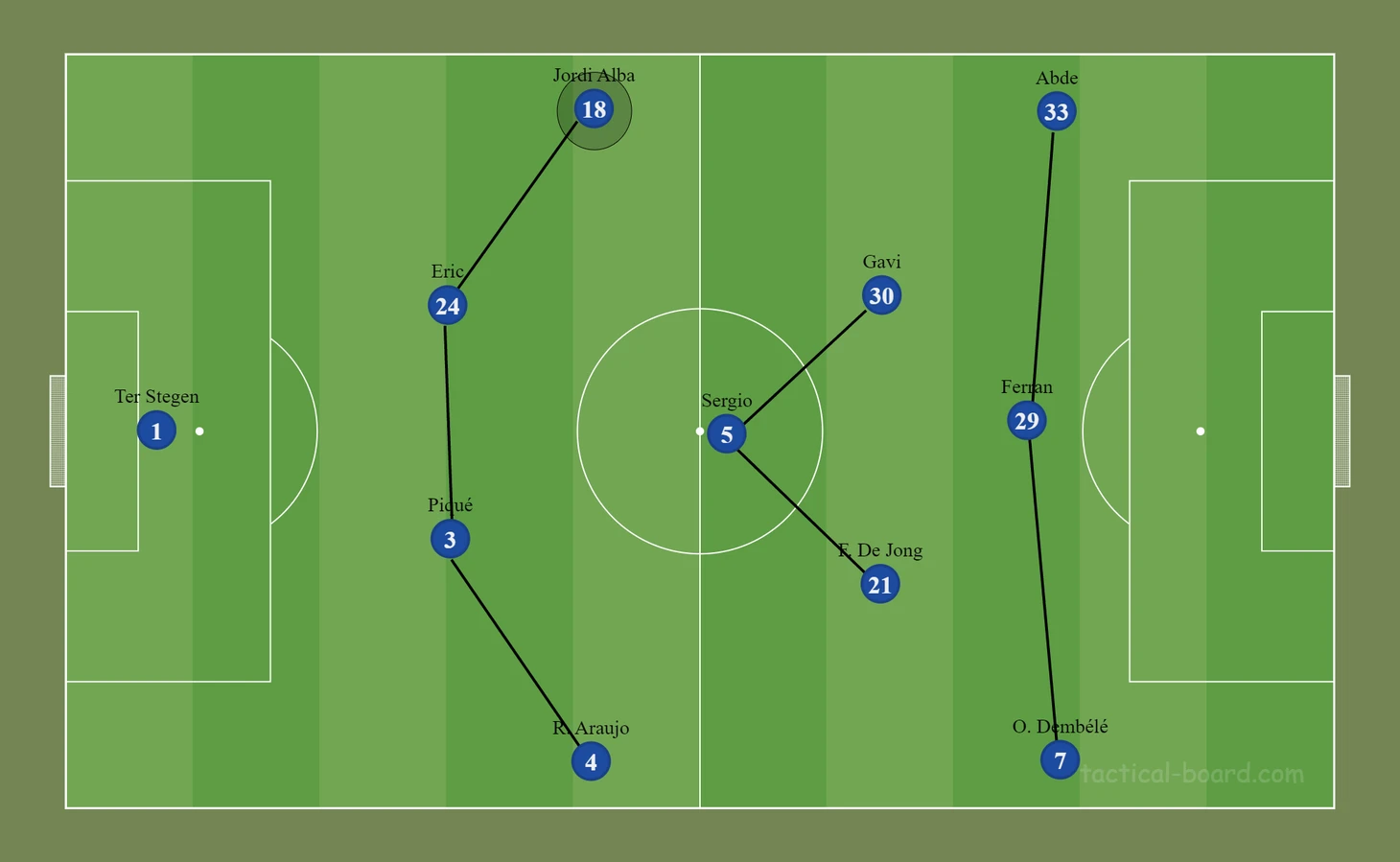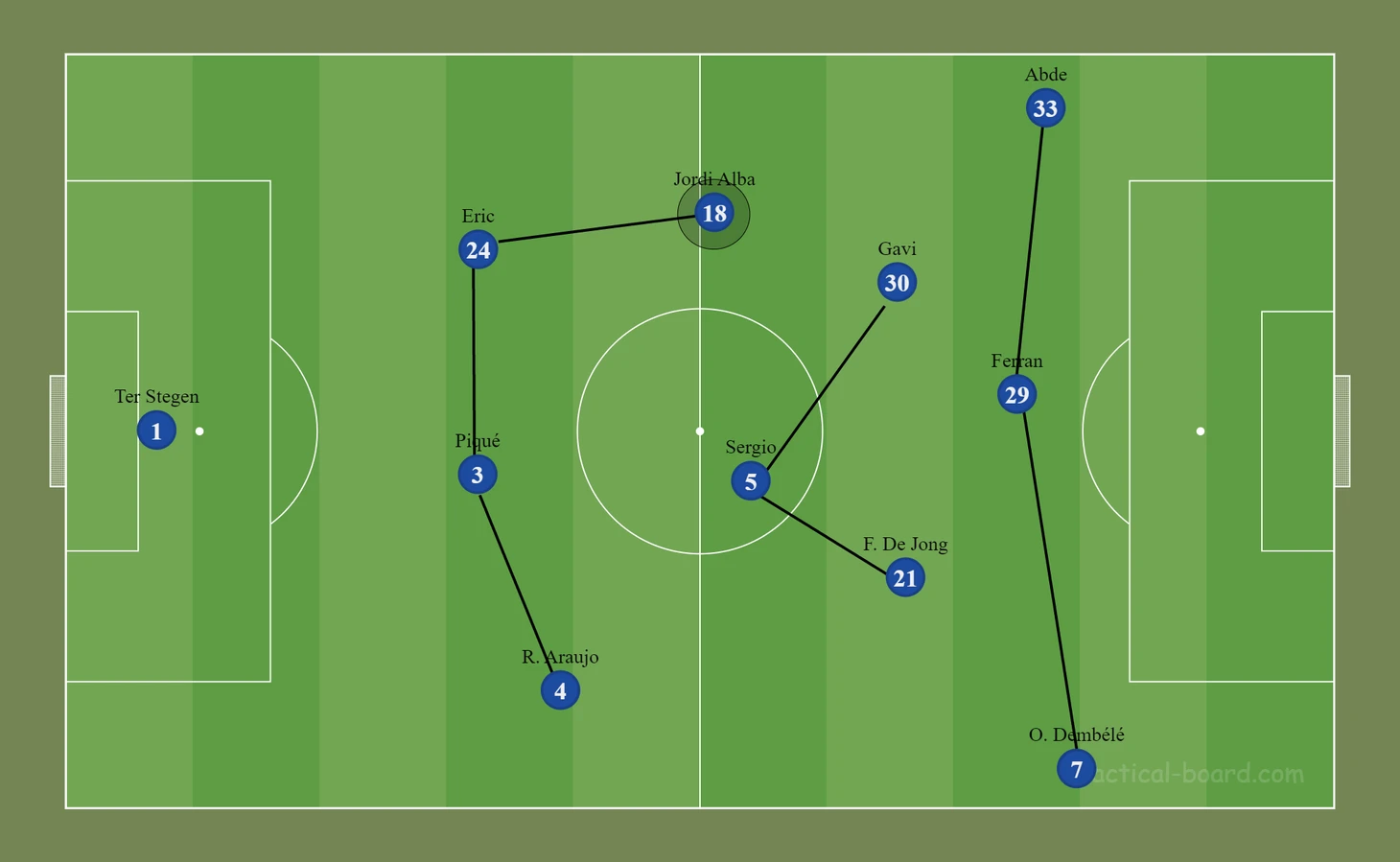 В последних матчах «Барселоны» можно было увидеть следующую трансформацию: классические 4-3-3 превращались в своеобразные 3-2-2-3. Араухо оставался сзади, а Альба поднимался выше, часто действуя в одной линии с Бускетсом.