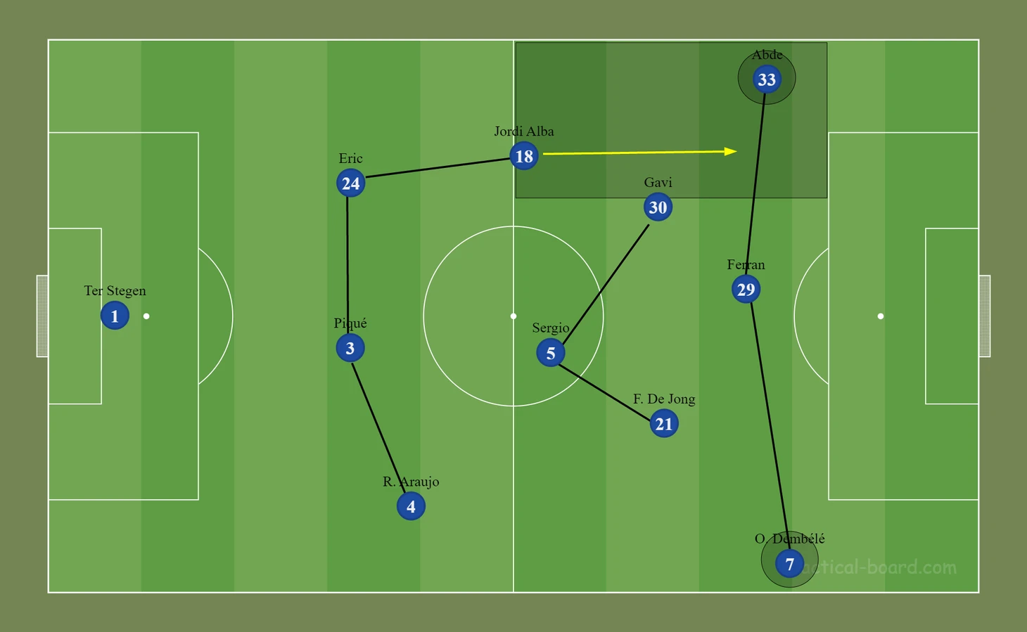 В системе Xavi за создание ширины отвечают вингеры, что отчасти может мешать Жорди в случае, если игрок атаки (в данных матчах Абде) своевременно не смещается в центр, оставляя фланг партнёру.