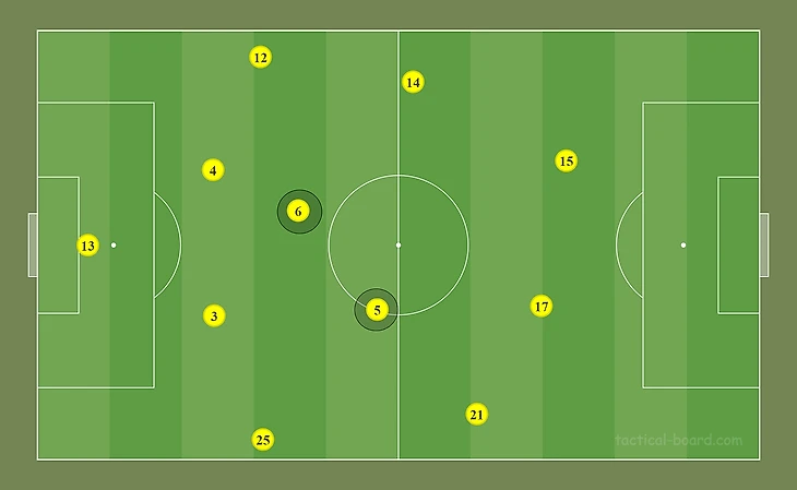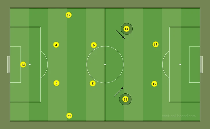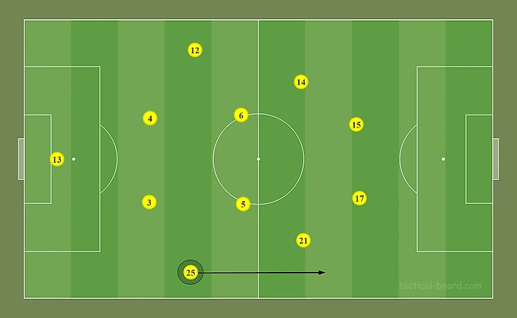 Для такого перестроения наилучшим вариантом на позицию правого крайнего защитника является Хуан Фойт. Аргентинец не поднимается по флангу, оставаясь в середине поля, что позволяет Йереми Пино смещаться на край поля, тем самым создавая ширину атаки, а затем продвигаться вперёд.