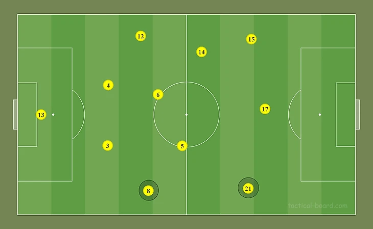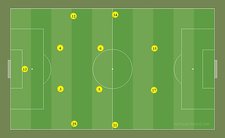 Без мяча команда использует схему 4-4-2. Данная формация позволяет создавать блок из двух линий по четыре человека, задача которого заключается в недопущении угрозы в штрафной площади и в зоне перед ней.
