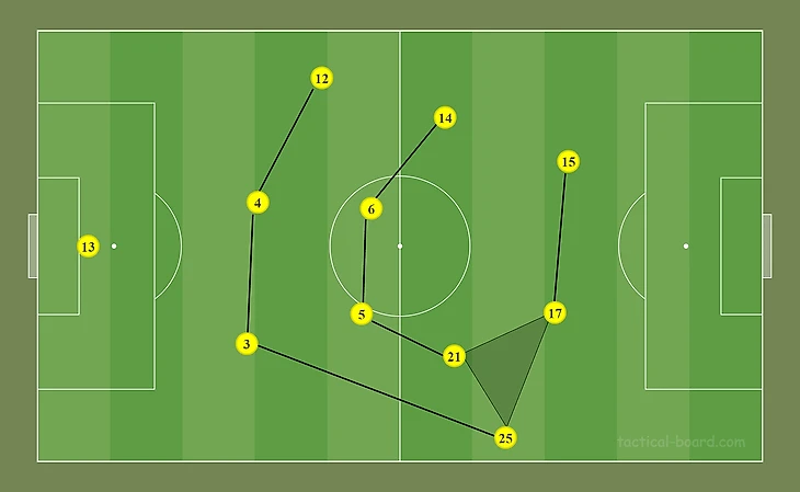 Треугольники на флангах являются ключевым фактором (крайний защитник, крайний полузащитник и сместившийся в полуфланг нападающий). Комбинации из трёх футболистов позволяют создавать численное преимущество в зоне, а затем проходить оппонентов за счёт комбинаций.