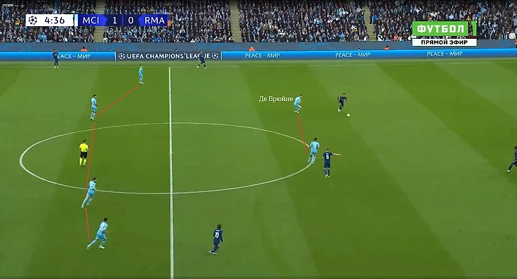 3. Без мяча «Сити» располагался по схеме 4-4-2. Де Брюйне поднимался к Жезусу. Команда Гвардиолы традиционно встречала соперника высоко, а вот «Мадрид» действовал достаточно разноплановно в контексте игры без мяча.