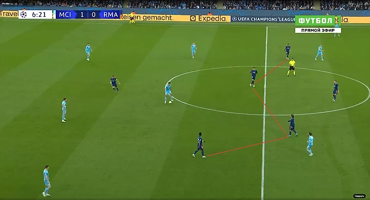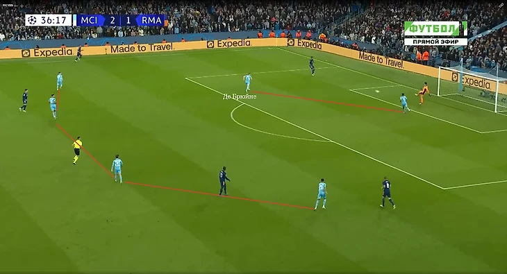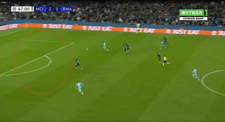 Эпизод из второго тайма. Теперь Начо, вышедший вместо Алабы, неудачно выдвигается на оппонента. Милитао страхует испанца, но по итогу оба остаются отыгранными, Марез бьёт в штангу, а Карвахаль чудом отбивает удар Фодена.