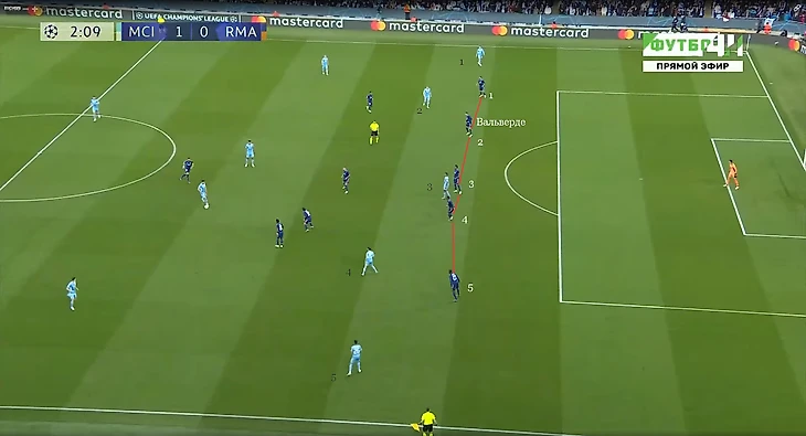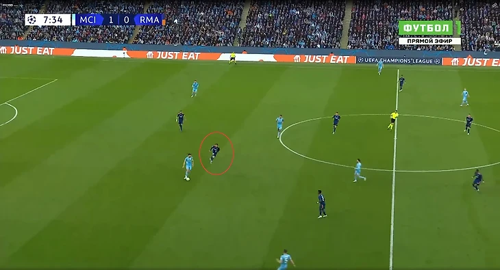 Периодически уругваец опускался пятым в защиту. Обычно «Сити» нагружает последнюю линию пятью футболистами, поэтому ход с опусканиями Вальверде смотрелся логично. Также полузащитник выступал на привычной для себя позиции в центре поля, периодически меняясь местами с Модричем.