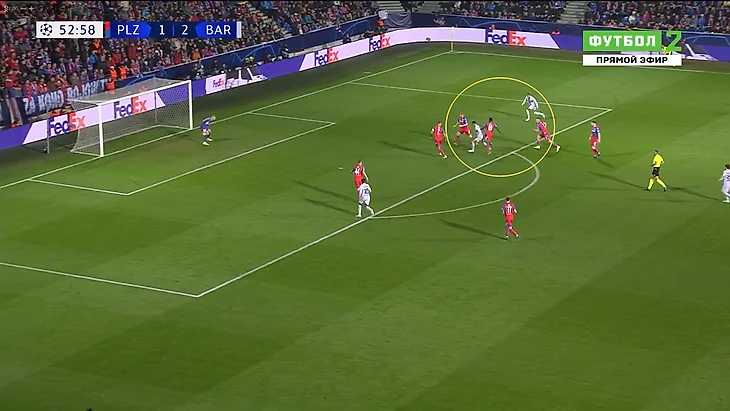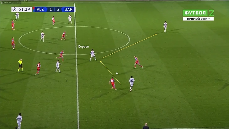 Здесь стянул на себя соперника и увёл его в центр, чем освободил зону для рывка Гави.