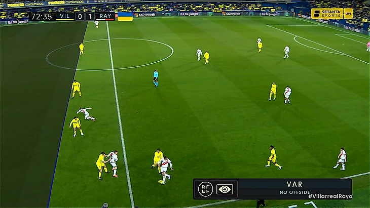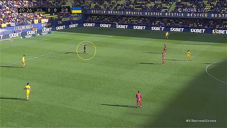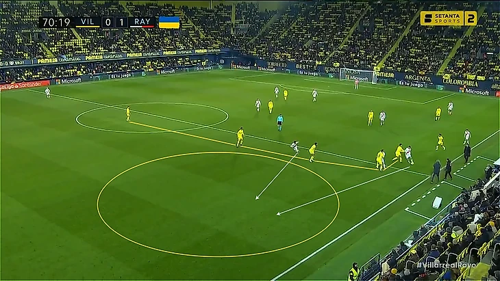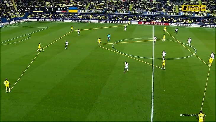 Без мяча команда Сетьена стремится к быстрому возврату владения. Средний PPDA при новом тренере опустился с 12 до 10, что говорит о повышении интенсивности прессинга. Высокая линия защиты является неотъемлемой частью качественного высокого прессинга, но иногда из-за неё приходится страдать. Например, в эпизоде с пропущенным голом от «Райо Вальекано»: соперник воспользовался свободным пространством за спинами высоко расположившихся защитников «Вильярреала».
