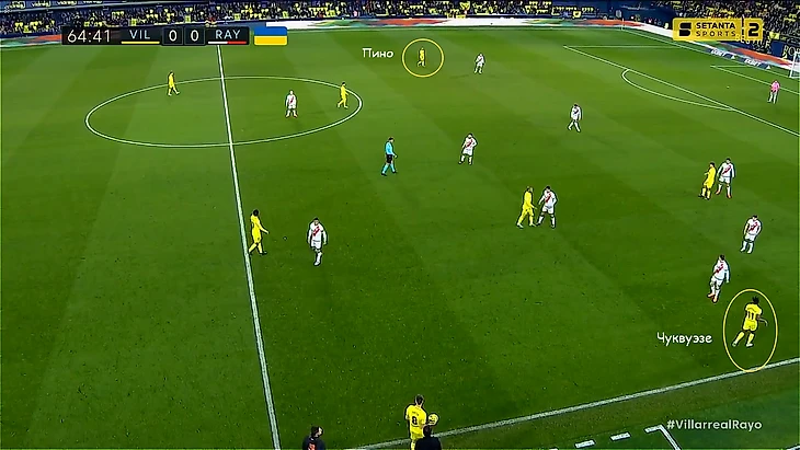 Показательны позиции фланговых игроков атаки Йереми Пино и Самуэля Чуквуэзе. Они действуют не как классические (Пино так действовал при Эмери), а как инвертированные вингеры (правша - слева, левша - справа). Это является отличительной чертой большинства команд, стремящихся играть в позиционный футбол. От крайнего нападающего требуется не подключаться по бровке и подавать/простреливать в штрафную, а участвовать в комбинациях и смещаться в центр.
