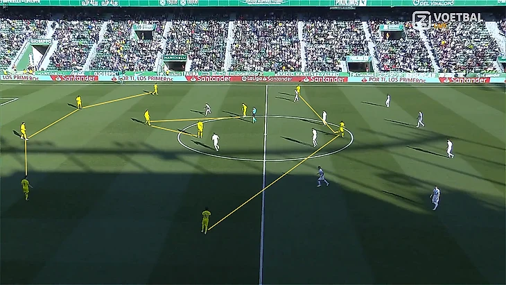Более подробно игру «Вильярреала» при Эмери описывал в отдельном тексте по ходу прошлого сезона. Здесь проговорю ключевые аспекты. Без мяча команда выстраивалась в 4-4-2/5-3-2 в зависимости от расстановки соперника. С мячом действовали по схеме 4-2-2-2/4-3-3. В общем, «Вильярреал» Эмери - команда с гибридной схемой и адаптациями под соперника.