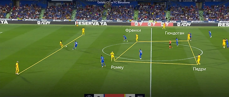 Для продвижения к центральным защитникам часто опускался Френки. Де Йонг совершил 8 продвигающих передач (лучший результат в матче, столько же у Кунде). Умение голландца протащить мяч через нескольких соперников помогало доставлять мяч вперёд, но там каталонцев встречала новая линия защитников «Хетафе».