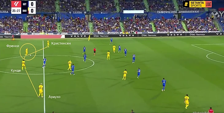 «Барселона» ожидаемо вышла с ромбом в центре поля: Френки и Ромеу в опорной зоне, выше расположились Гюндоган (левый полуфланг) и Педри (правый полуфланг). Сзади образовывалась тройка Кристенсен-Кунде-Араухо. Обращаем внимание на то, что центральным был именно Кунде. Ширину создавали Бальде и Рафинья. Левандовски на острие.