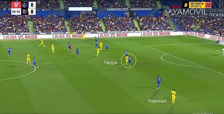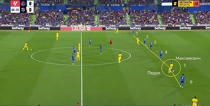 Это зависело от позиции Педри. Максимович персонально отвечал за полузащитника каталонцев. В моментах, когда Педри был в середине поля, Максимович закрывал испанца там. Когда полузащитник подключался вперёд, серб опускался за ним и садился шестым игроком в линию.