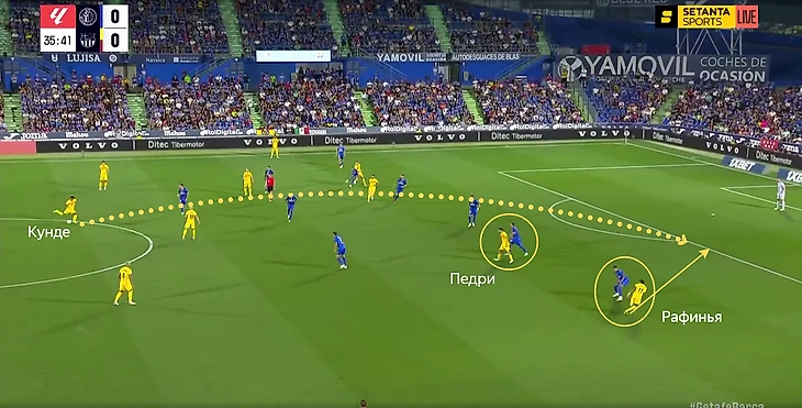 Иногда «Барса» могла использовать данную опеку в свою пользу. Например, когда Педри уходил в глубину, а Максимович следовал за ним. В таких эпизодах за спиной серба образовывалась свободная зона, в которую мог вбегать Рафинья. Одна из таких ситуаций закончилась самым опасным моментом «Барселоны» в первом тайме.