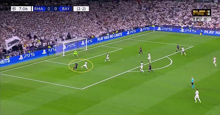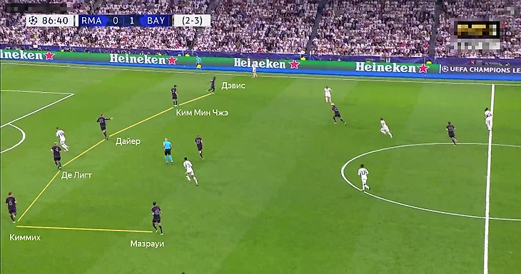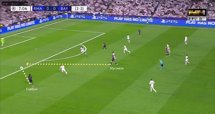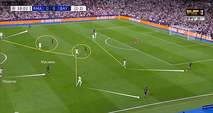 «Реал» смелее шел в прессинг и оказывал более серьезное давление на игроков «Баварии» в начальной стадии: перекрывались опорники, Винисиус и Родриго действовали по центральным защитникам. На Мусиалу, который оказывался в центре без персонального оппонента, выдвигался Рюдигер.
