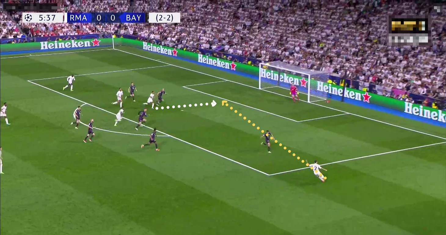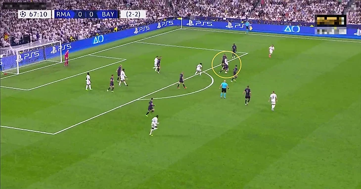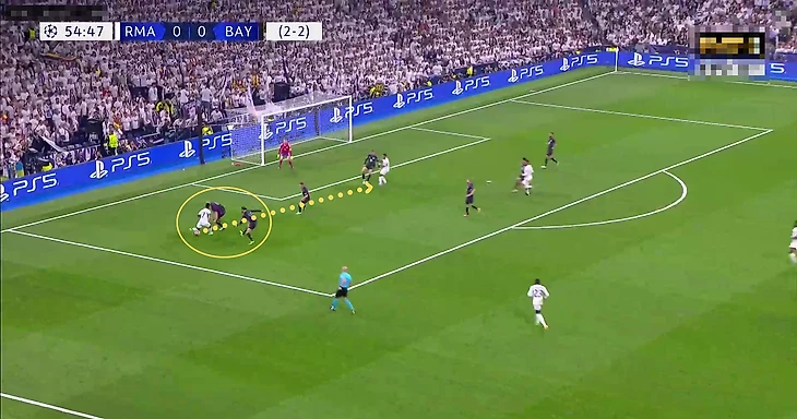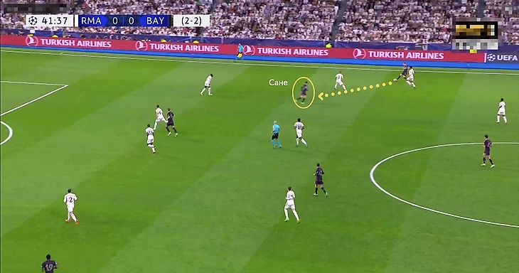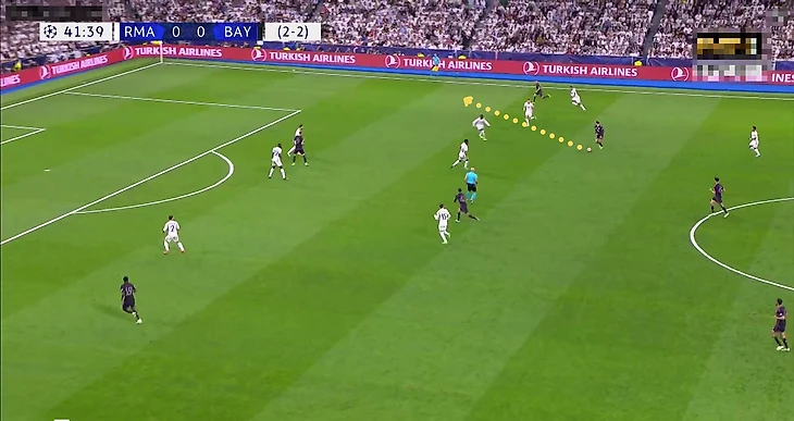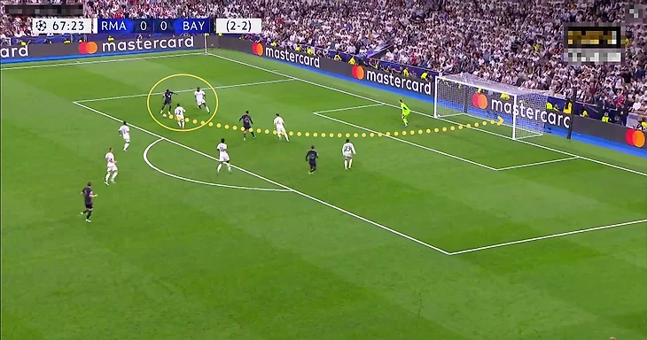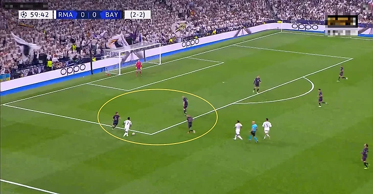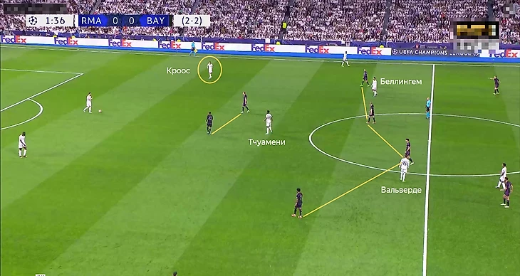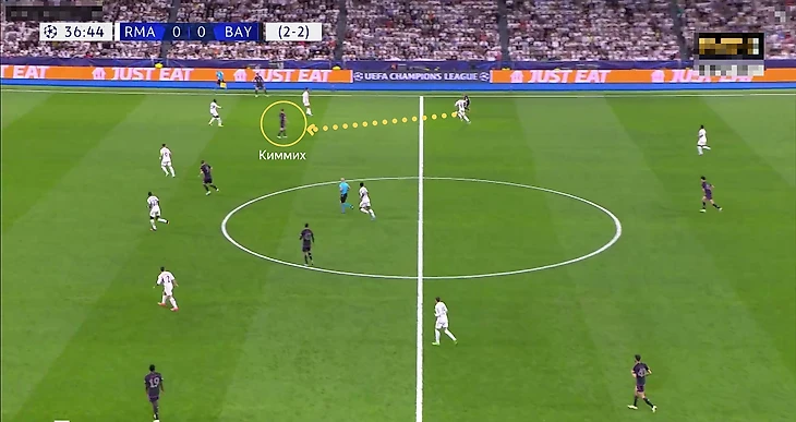 В начальной стадии у «Мадрида» образовывалась тройка, что давало численное преимущество против двух игроков «Баварии» в первой линии. Также из-за отсутствия интенсивного давления со стороны игроков команды Тухеля Кроос получал достаточно свободы и времени на принятие решений и продвижения атаки через передачи: лучший в матче по продвигающим передачам (6), второй по предударным действиям (7), третий по очкам ожидаемой угрозы (0.21).
