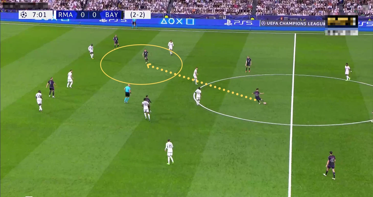 Пара игроков в первой линии (Кейн, Мусиала) должна была перекрывать пару опорных «Мадрида» (схемы накладывались друг на друга). Ожидаемо команда Анчелотти решала данный вопрос за счет опусканий Тони Крооса к центральным защитникам.