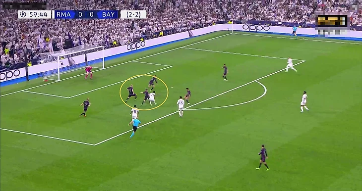 Также в первом тайме мюнхенцам удавалось совершать подходы к воротам через зону Тони Крооса, Рассмотрим на нескольких примерах.