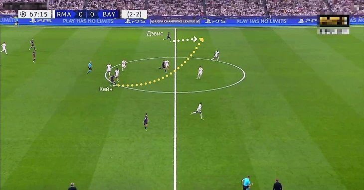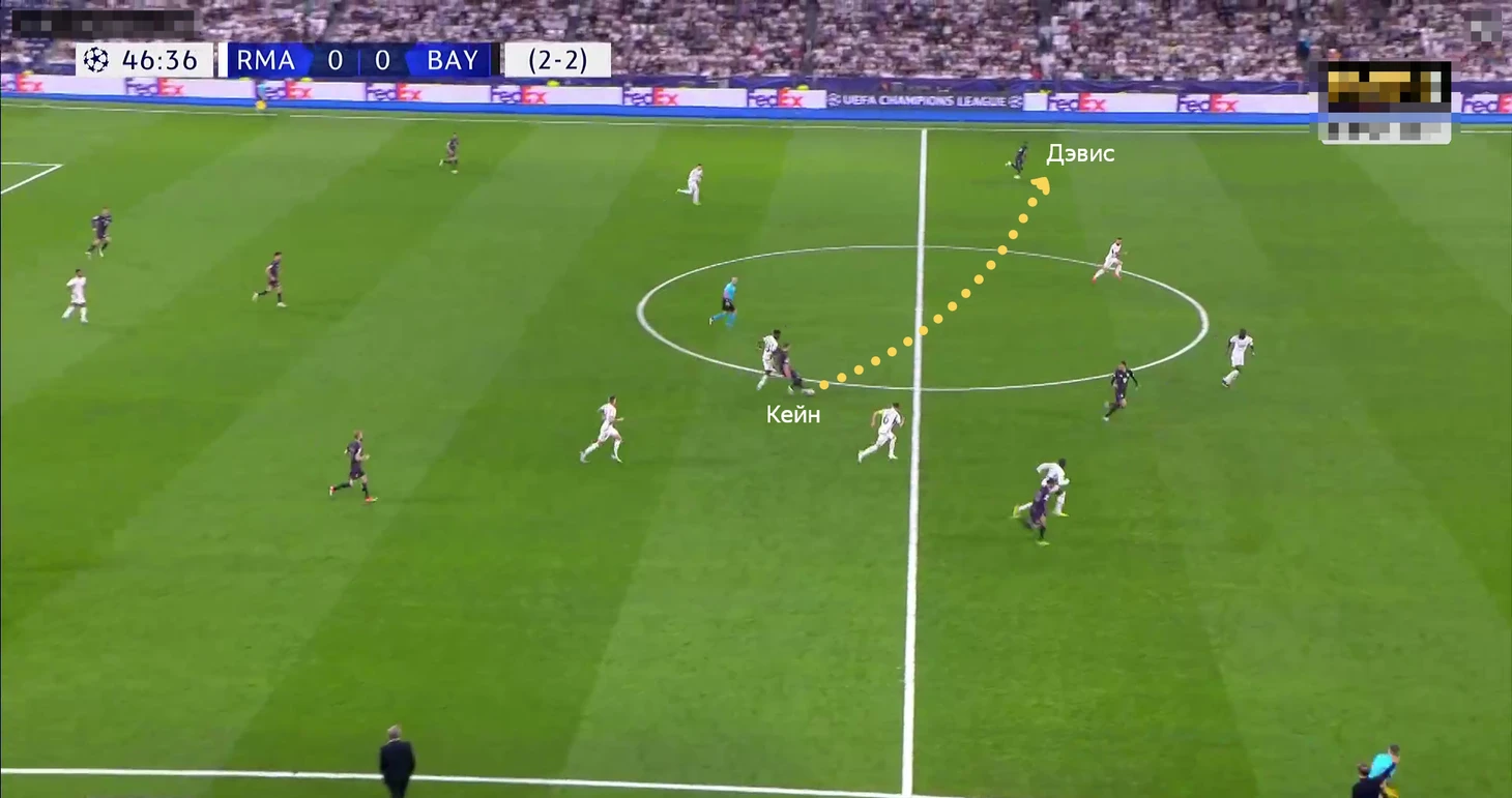 Эпизод с голом пришел из похожей ситуации – успешная контратака «Баварии»: Мусиала здорово отобрал мяч у своей штрафной и запустил атаку своей команды. Дальше Кейн снова из глубины сделал передачу на свободного Дэвиса, который убежал и забил.