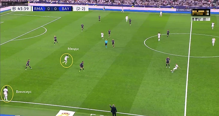 В первом тайме за создание ширину в команде Анчелотти отвечали крайние защитники: Менди слева, Карвахаль справа. Винисиус в такой конфигурации действовал больше в полуфланге. Понятно, что степень свободы у футболистов «Реала» позволяла меняться позициями (ситуативно могло быть другое расположение), но в большинстве случаев за ширину отвечали именно Менди и Карвахаль.