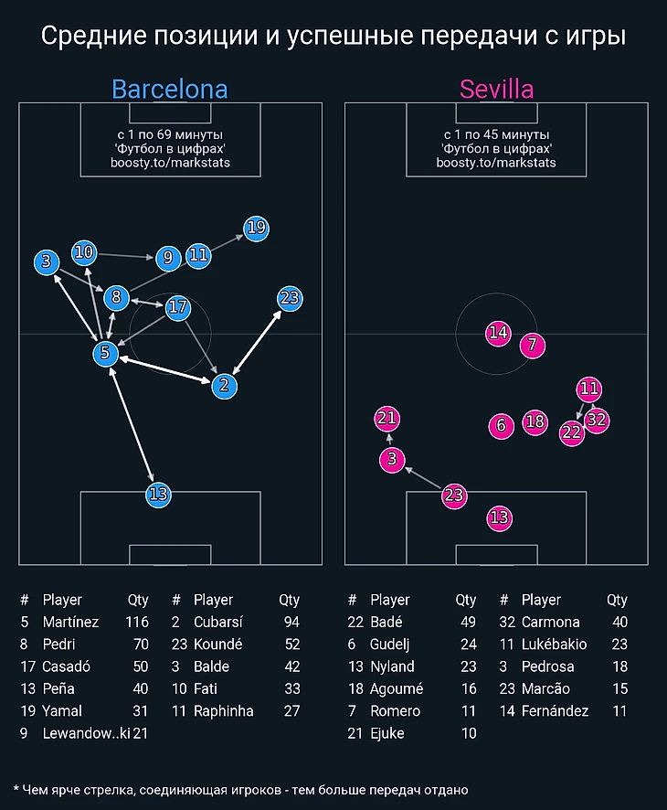 Карта усредненных позиций также отлично иллюстрирует, где проходила большая часть матча. 54% от всех своих касаний игроки «Севильи» совершили на своей трети.