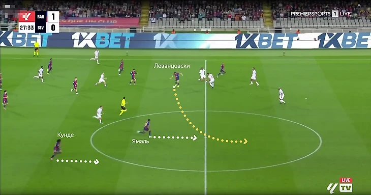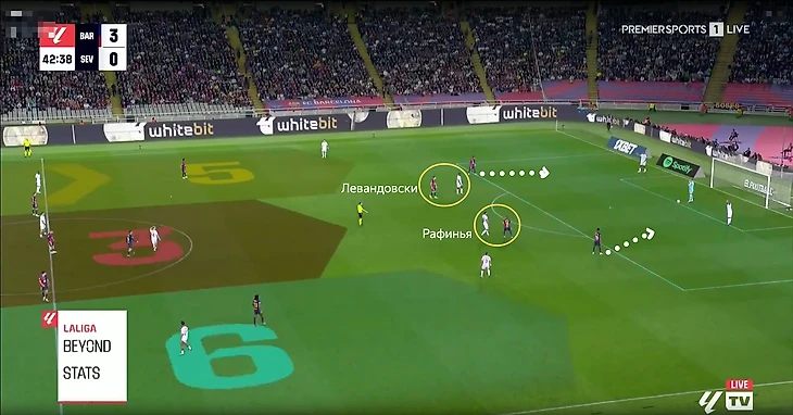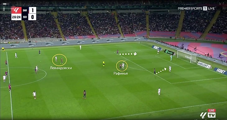 Но иногда (так получилось в матче против «Севильи») соперника задействует в центре только одного игрока. Другой футболист идет выше. В таком случае один из игроков «Барсы» также следовал за своим персональным оппонентом, не оставаясь при этом на своей более привычной позиции. Здесь на примере очень глубокой позиции Левандовского это хорошо видно.