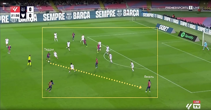 При этом даже это зачастую не помогало. Например, здесь даже относительно плотная по количеству игроков оборона гостей не дает надежности: Педри отдает в коридор пас на свободного Ямаля. Затем свободу на входе в штрафную получает Рафинья – так пришел заработанный пенальти.