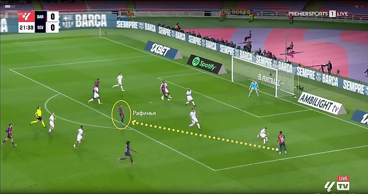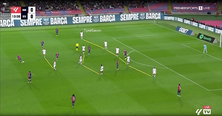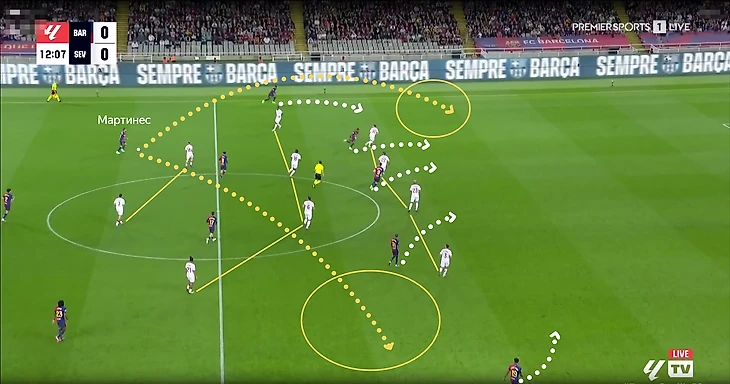 Прессинг «Барсы» также осложнял ситуацию для «Севильи». Обращаем внимание на одну интересную особенность