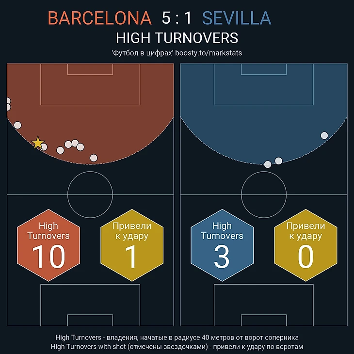 Сразу можно сказать, что в данном противостоянии каталонцы (как и в принципе в матче) превзошли соперника. Вот картинка с высокими отборами мяча со стороны хозяев.