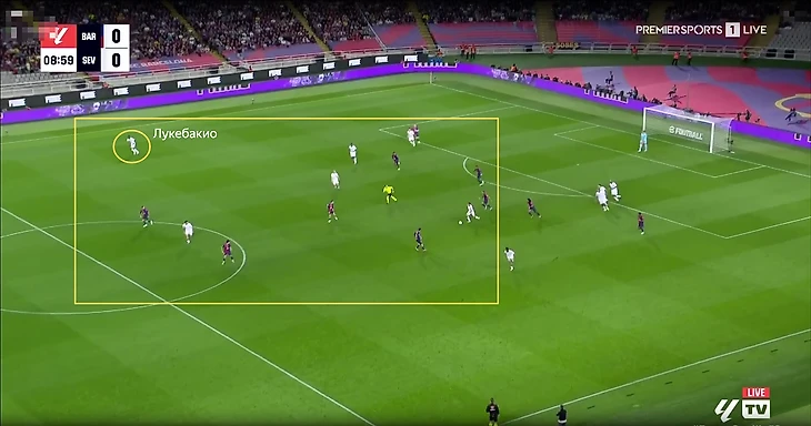 В последней линии у команды Флика зачастую образуется перегруз из 5-6 футболистов, поэтому в данной стадии «Севилья» также адаптировала свою схему: Доди Лукебакио садился пятым в линию.